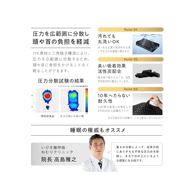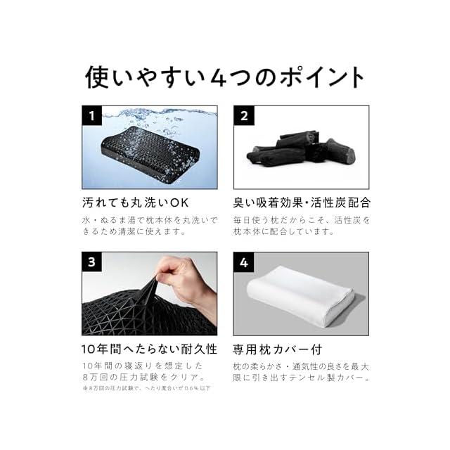 【使用上の注意】枕の使用により首や頚椎に違和感を感じた場合は、無理に使用を続けず、一度ご使用をお控えください。症状が続く場合は医師にご相談ください。枕の感じ方には個人差がありますので、ご自身に合った使用方法でお試しください。