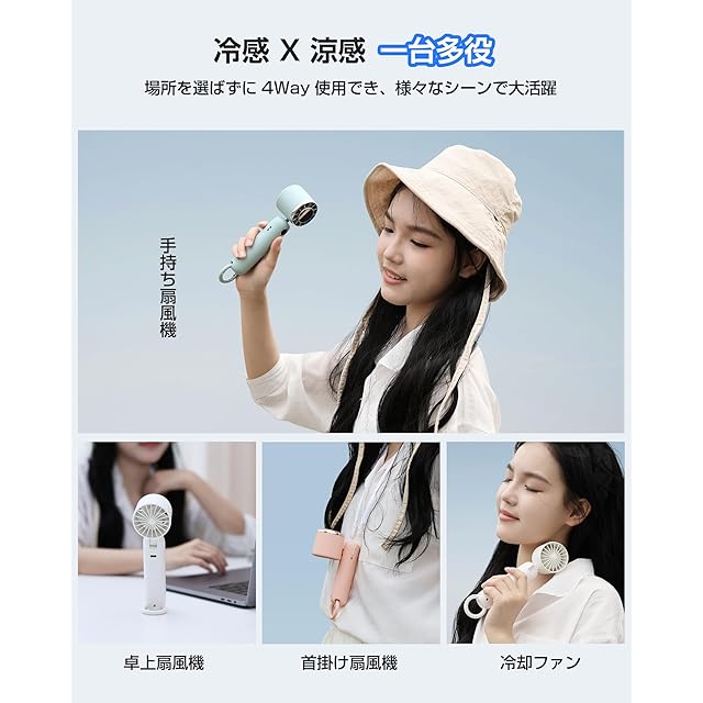 【1台多役&携帯便利】4Wayの使い方ができるハンディタイプの携帯扇風機です。①手にフィットするスリムなボディー設計で、握りやすく、手持ち扇風機として長時間使用しても疲れを感じません。②長さを自由に調節できるネックストラップが付いており、ハンズフリーで首にかけて使用でき、作業中や移動中にも便利です。③スタンドとしても使用可能なカラビナが付属しており、卓上での使用もできるため、卓上扇風機としてオフィスや自宅でも便利にお使いいただけます。④冷却プレートを肌に押しあてることで瞬時に肌を冷やすことができるため、ネッククーラーややけどの応急冷却グッズとしても活躍します。軽量かつコンパクトなサイズなので、いつでもどこでも手軽に持ち運ぶことができます。