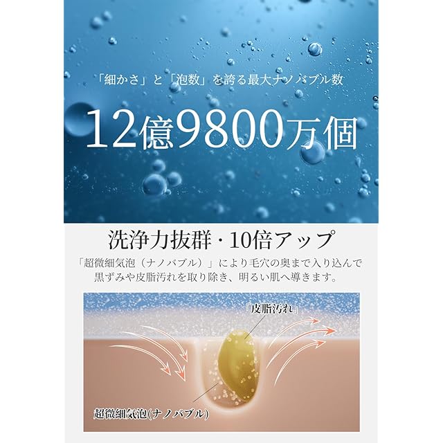 【超微細泡&洗浄力】ナノバブル技術で最大約12億9800万個の超微細泡を生成し、毛穴や肌の奥深くまで浸透。通常の水よりも優れた洗浄力で、メイクや皮脂汚れをスッキリ落とし、つややかな肌を実現します。