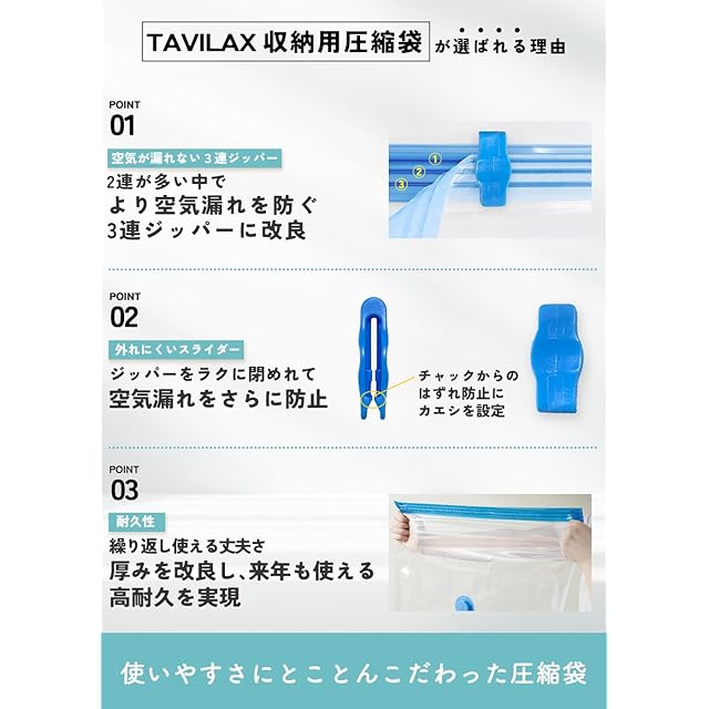 【長期間でも空気漏が漏れない】圧縮袋を使用した人の悩みで圧倒的に多いお声は、時間が経つと空気が混入してしまうこと。その悩みを解決する為に、TAVILAX独自で3連ジッパー仕様にしました。今までとは違う長期保管に優れた圧縮袋です。