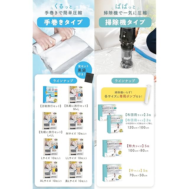 【各サイズ】[布団用 120*100cm ]:羽毛布団や掛け布団から布団一式まで大判のものにオススメ。[特大 100*80cm ]:面積を取るダウンジャケットから枕やバスタオル、ぬいぐるみなどにもオススメ。