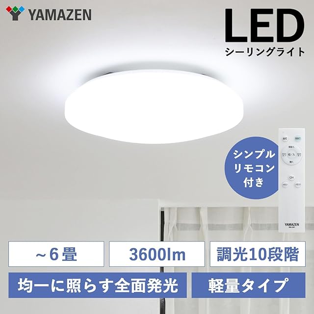商品名:[山善] LEDシーリングライト 6畳 (日本照明工業会基準) 3600lm 室内/天井照明 10段階調光タイプ 常夜灯 リモコン付き 和室 リビング 寝室 メモリ機能 OFFタイマー (30分/60分) LC-G06