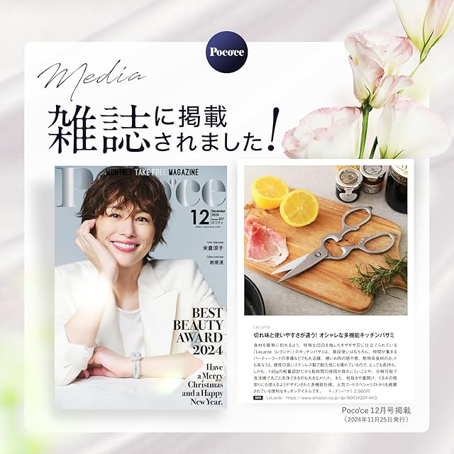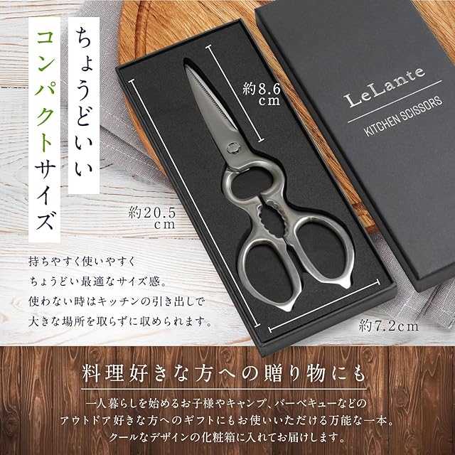 【選ばれる理由】 LeLante キッチンハサミ がついに正式販売開始。ギザ刃加工で食材の断面も綺麗な切り口に。 また、硬度の高いステンレス素材を使用しているので耐久性に優れ、硬いお肉の筋や骨、乾物系も簡単にカットできます。