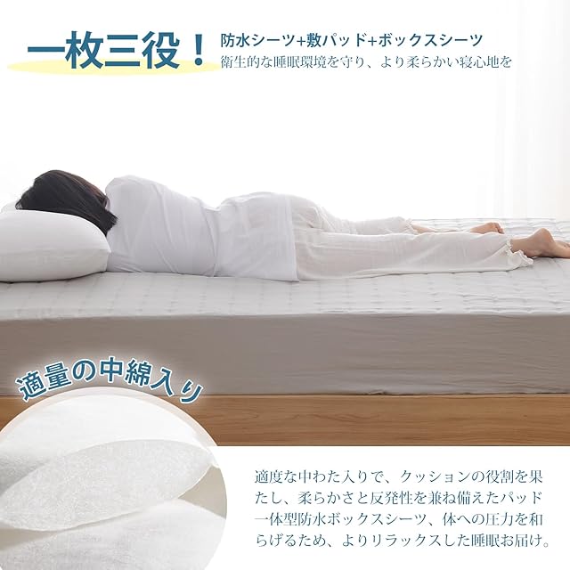 【1枚3役】防水シーツ、敷きパッドとボックスシーツが合体で楽々!ほどよいボリュームの中綿を充填して、ふんわり心地よい寝心地を実現。普通のボックスシーツより厚くて、柔らかさと反発性を兼ね備えたパッド一体型ボックスシーツです。