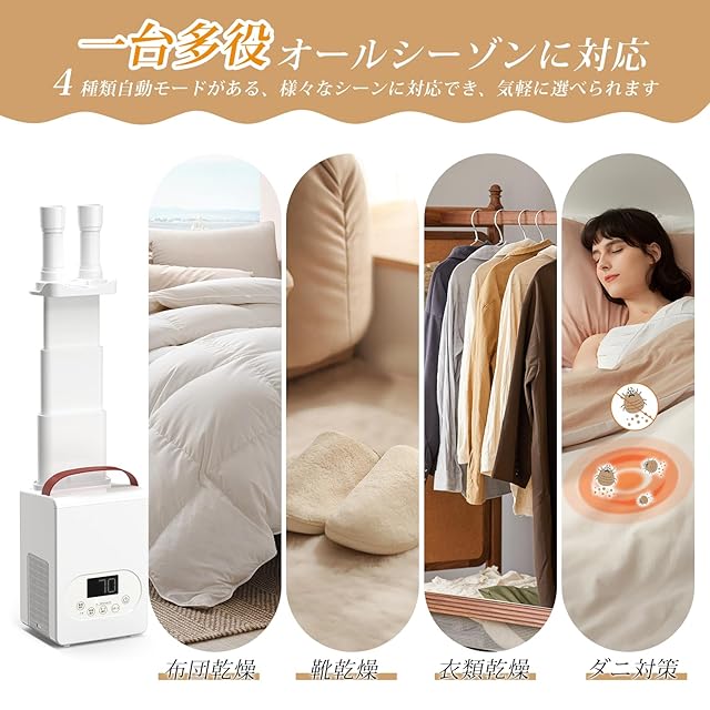 本体内部の送風機(ファン)と電熱ヒーターから、伸縮パイプを通して温風を送り込み、その熱で布団の湿気をとって、乾燥させます。<br> 革新的な引き出し式のホースが布団乾燥機に完璧に縮められ、まるで消えたようです。縮まったホースの長さがゼロ!使わない時のスペースを取りません <br>電源コードも布団乾燥機の中に詰め込められるし、引き出しやクロゼットに気軽に乾燥機を片づけられます。<br>ふとん乾燥機は本体にある伸縮ホースが長さ45㎝で、付属の二本ノズルを併せて最大約95cmまで延長でき、布団の胸元と足元の両方に差し込むことが可能で、一人暮らしや家族生活両方とも活躍できます。<br>それに、ふとん乾燥機の伸縮ホースが自立できます!梅雨に濡れた衣類にまっすぐに向けて乾かされます。<br>ふとん乾燥機に靴乾燥に対応できる二本伸縮ノズルが含みます。布団乾燥、布団あたためだけでなく、衣類乾燥や靴乾燥全部対応できます。