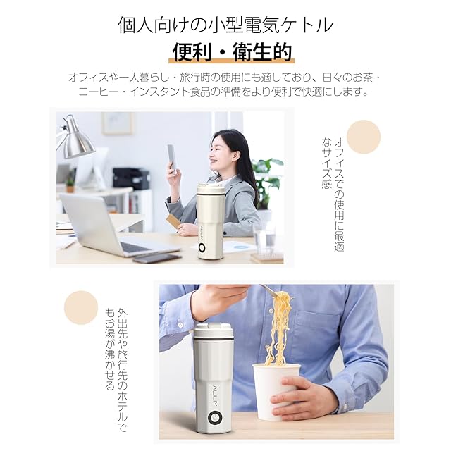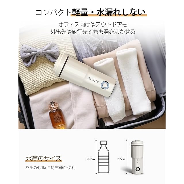 【理想の生活を追求!軽量小型で持ち運びる】Aliliy携帯用400mlのポータブル電気ケトルは小さいサイズで職場のデスク上に置いても場所を取らないです。小型軽量でバッグやスーツケースに入れて持ち運びやすく、コンセントやポ-タプル電源に繋けば、いつでもお湯が沸かせます。小型電気ポットは衛生面が気になる人や、出張先や旅行先や外出先でも温かい飲み物を楽しみたい方にぴったりです。仕事・家事・勉強・旅行などの途中でお湯を沸かしコーヒーブレークで「美味しい時間」を楽しむ!