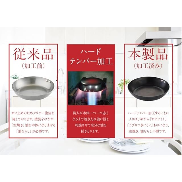 職人がこだわった本格仕上げで「こびりつきにくく」「サビにくい」フライパン 鉄(26cm)です。独自の加工方法の『ハードテンパー加工』で、使いはじめの使いにくさ解消。使い込めば使い込むほど油なじみが良く焦げ付きにくくなり、長く使うほど愛着がわきます。