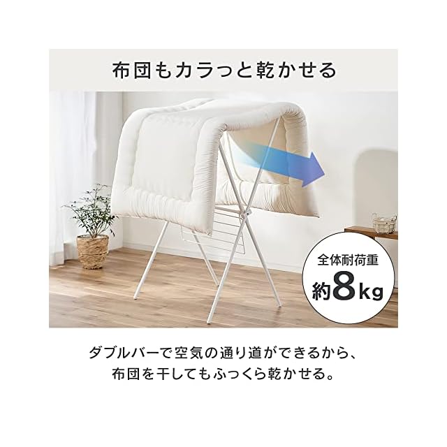 一度に干せる目安<タオルハンガー使用時>シャツ等:7枚、バスタオル:4枚、小物:20枚<タオルハンガー未使用時>シャツ等:10枚、バスタオル:4枚 ※ハンガーとピンチハンガーを使用