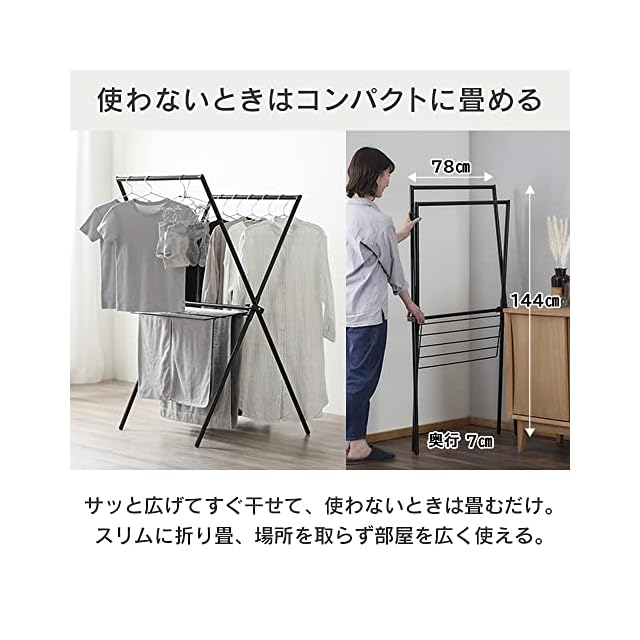 商品名:アイリスオーヤマ 洗濯物干し 物干しスタンド 室内物干し ブラック X型 使わないときはコンパクトに畳める 簡単組立 インテリア性にこだわった 布団もカラっと乾かせる 着脱可能なタオルハンガー付き 幅約76×奥行約62×高さ約130 シンプル 一人暮らし 家族 ラック STMX-770