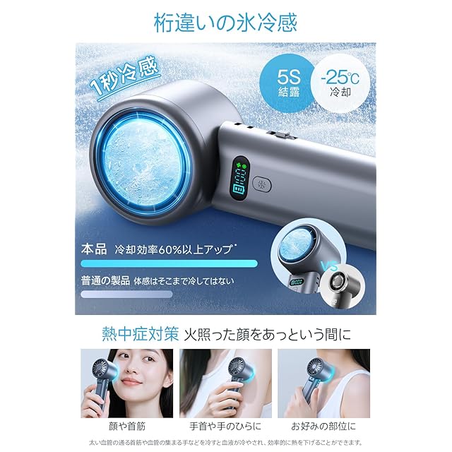 【-25℃瞬間冷却・1秒氷感!熱中症対策バッチリ】冷却プレート付き扇風機です。冷却モードに切り替えて、プレート部を火照った肌に当てれば、まるで氷のようにひんやり冷たい感触が実感できる冷感扇風機。ただの風では物足りない猛暑日に、体感温度を一瞬で下げられるため、熱中症対策に最適。通勤通学、街歩き、スポーツ観戦、花火大会、お祭り、野外イベント、夏フェス、ライブ、キャンプ、旅行などに適用、真夏を乗り越えるお供にぴったりなハンディクーラーです。
