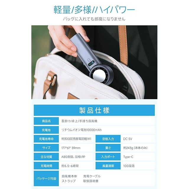 【LEDディスプレイ・誤作動防止機能】バッテリー残量、各段風量と冷却モードがLEDディスプレイに常に確認でき、使用状況や充電のタイミングも把握しやすい。電源ボタンはスライド式で、長押しでON・OFF、使用しない時の誤作動を防げます。【パッケージ内容】携帯扇風機本体、ストラップ、充電コード、取扱説明書。【一年メーカー付き】万が一、初期不良やその他不具合が発生した場合は、商品ページの販売店舗名をクリックして、「質問する」ボタンより店舗までご連絡いただければ迅速に対応いたします。