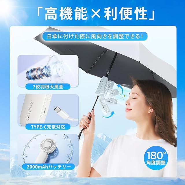 【日本初登場】シシベラ 日傘 ハンディファン 小型 携帯扇風機 3段階風力調節 ミニ扇風機 小型扇風機 ミニファン USB充電 Type-C対応 ギフト プレゼント 贈り物 パールレース
