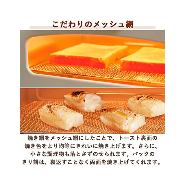 【こだわりのメッシュ網】網目の細かいメッシュ網を採用したことで、食材が下に落ちにくくトーストの裏面の焼きムラがさらに改善し、よりおいしいトーストを実現しました。また、パック餅を焼く際にアルミホイルを敷かなくても膨らんだお餅のくっつきを防ぎ、両面をしっかり焼くことができます。外はパリッと香ばしく、中はもっちりとしたおいしいお餅が焼けます。
