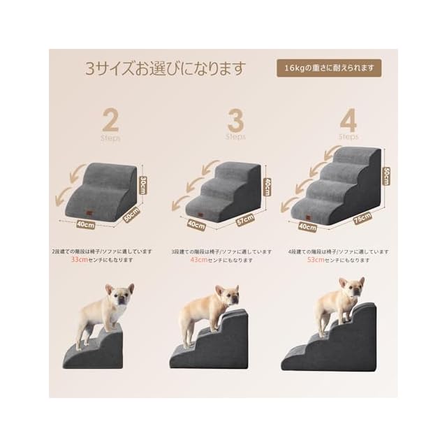 【2つのステップサイズ】この犬用階段には2つのステップと3つのステップがあります。2つのステップは約33センチの椅子/ソファ/ベッドに適しています。3つのステップは約43センチの椅子/ソファ/ベッドに適しています。