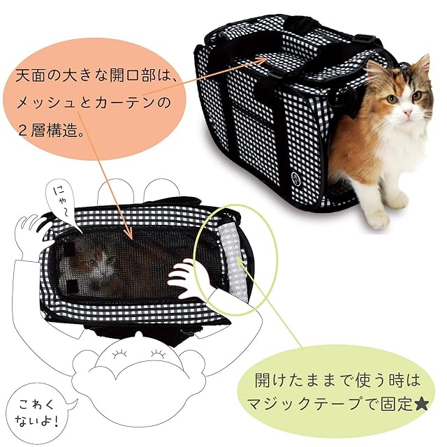 【開口部は2箇所で1箇所はカーテン付きの2層構造】正面には入り口として便利な小さな開口部、天面には大きく開くメッシュとカーテンの2層構造の開口部があります。どちらも使わない時はくるくると巻いてマジックテープで固定できるので、キャリーに入ったまま診察を受ける時でも邪魔になりません。