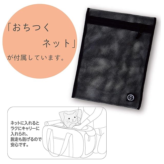 【取り外し可能な底板&おちつくネットを付属】ポータブルキャリーには別売りもしている「おちつくネット」を付属しています。キャリーに入るのが苦手な猫でも安心。通院時もネットに入ったまま診察を受けられます。取り外し可能な底板はゴムバンド付き。猫のお気に入りのタオルやペットシーツを固定して使用できます。2箇所の収納ポケットがあるので、ペットシーツの替えを入れておくこともできます。