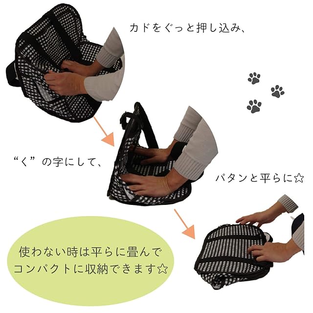 【使わない時は小さく折りたたみ収納できる】猫壱のポータブルキャリーは、組立時サイズ幅46x高さ25x奥行25cmですが、使わない時は平らに折りたたむことができます。収納スペースを取らず、スッキリとしまうことができます。
