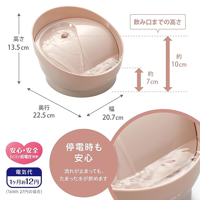 はじめてでも飲みやすいお皿タイプ。夜のおやすみも邪魔をしない超静音*DCポンプ採用。流れる、たまる2つの飲み方で停電時も安心。*ポンプ音約20%低減 (当社従来比)。アダプターは別売です。