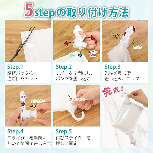 今まで面倒だった詰め替え作業がなくなりました。 詰め替えパックを簡単セットするだけでそのまま使えます。 シャンプーリンスなどの詰め替えパックに取り付けることで使用することができます。 逆止弁構造で、空気の逆流を防ぎ酸化防止になります。 真空状態を保つことで、雑菌の繁殖を防ぎます。 ぶら下げて使うことで、最後の最後まで洗剤を使えます。 ■特長 ・ホルダーとポンプを詰め替えパックにセットするだけで、そのまま使用できます。 ・今まで面倒だった詰め替え作業がないので、取り付けたらそのままサッと使用できます。 ・ボトルを使わなくてすむので、お風呂場がスッキリします。 ・詰め替えの手間(洗浄・乾燥・補充)がない。 ・取り付け、取り外しは、簡単ワンタッチ。・片手で適量が抽出でき、赤ちゃんとの入浴時にも便利です。 ■使用方法 (1)詰め替え用パックの出口を1.5〜2cmの幅になるようにカットします。 (2)レバーを開いたポンプを根元までしっかり差し込んでください。 (3)レバーを閉じて固定します。 (4)ホルダーのスライダーを手前に引き、詰め替えパックの端をはさんで 再びスライダーを押して固定して吊るすだけ。 (5)ポンプを押して使用できます。 ■ポンプの取り付け方 ・通常のパックは出口をカットしてから取り付けて下さい。 出口がパイプ形状の場合にはその部分を切り取らずに、 反対側をハサミで切って下さい。(開口部寸法15-20mm) ※カット面はクリップの根元まできちんと差し込んで下さい。 ・詰め替えパックの出口がネジタイプの場合にはクリップ部をポンプから外し、 ポンプを直接ネジに取り付けてご使用下さい。 なおネジが合わない場合には蓋は締めたまま、反対側をハサミで切って取り付けて下さい。 ・詰め替えパックの開口部が20mm以上ある場合や、 詰め替えパックの形状が特殊な場合は、使用できないこともあります。 ・ご使用中に液漏れした場合は、 ここまでの説明に従ってポンプをセットし直して下さい。