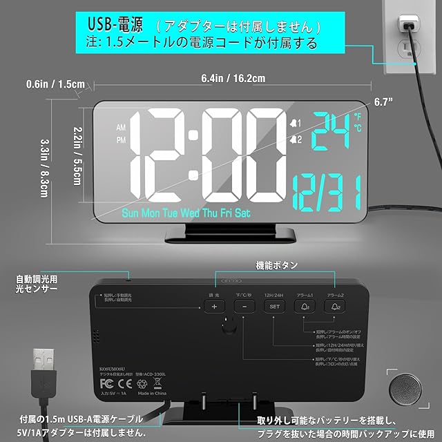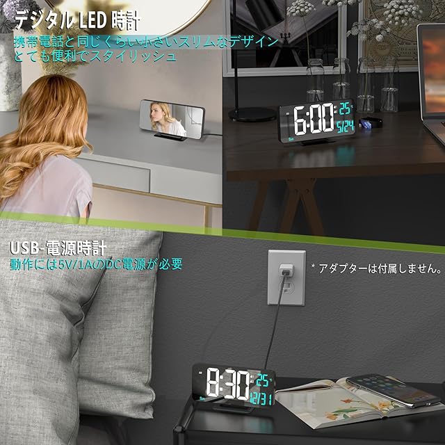 [USB-電源供給プラグイン式] このデジタルLED時計は、動作には5V/1AのACアダプター(別売り)が必要です。また、電源が切れた際に時間を保持するためのボタン電池も付属していますが、連続的な電源供給として使用することは意図されていません。