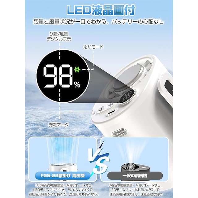 商品名:【2025新登場・冷却プレート付き】腰掛け 扇風機 ベルトファン ハンディファン 冷却プレート 携帯扇風機 充電式 アウトドア 5000mAh電池内蔵 100段階風量調節 LEDディスプレイ くびかけ 手持ち 4way腰掛けファン 屋外作業 農業 街頭販売 野外活動 花火大会 首掛け 両面クリップ付