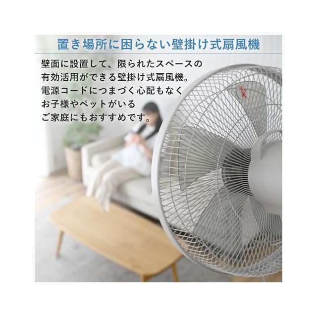 【壁掛け扇風機】壁面に設置して、限られたスペースの有効活用ができる壁掛け扇風機。置き場所に困りがちな脱衣所・洗面所などで活躍します。リモコンが付属しているので、高い場所に設置しても操作は簡単です。