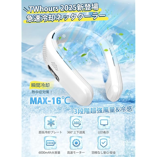 TWhours 首掛け扇風機 冷却プレート 【2025年夏新型・3段階風量&冷感調節・超長冷感プレート】瞬間冷却ネッククーラー 首掛けクーラー -16℃体感温度ダウン U型ネックファン LEDディスプレイ表示 Type-C充電 6000mAh大容量 6つの大型送風口 羽なし 上下送風 自由に調節可能 軽量 持ち運び便利 熱中症対策 父の日/母の日/誕生日 プレゼント ギフト (ホワイト)
