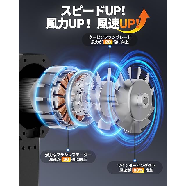 【ダブルタービンファン・風量2倍!】タービンファン構造:前部の固定タービンダクトと後部の回転ファンからなる2重タービンファンを採用しおります。KOJIHOMU独自のこの設計により、コンパクトサイズながらも大風量を実現しています。後部のタービンファンが空気を効率的に集め、前部のファンが強力な筒状の風を送り出します。
