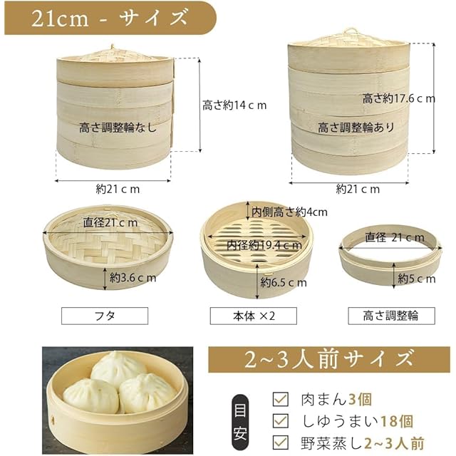 ✅【サイズ】「せいろ本体」は 21cm(2〜3人家族向けサイズ)です。さらに、ご自宅の鍋やフライパンのサイズに応じて「蒸し板(受け台)」のサイズを 22cm,26cm,30cm,32cm,35.5cm の中からお選びいただけます。※※※ 蒸し板(受け台)の詳しいサイズ表記は商品ページ内の「蒸し板の選び方」の画像をご参照ください ※※※