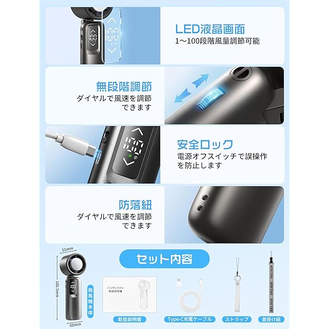 【サイズ】約60mm×51mm×180.5mm;重量:約250g;セット内容:扇風機本体、首掛け紐、ストラップ、充電用USBコード(Type-C充電式)、取扱説明書。