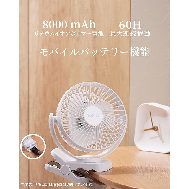 Yokizu 卓上扇風機 クリップ 小型 静音 リモコン付き usb充電式 8000mAh大容量 急速充電 60h連続使用 LEDライト モバイルバッテリー 風量3段階 ファン キャンプ リビング 会社 持ち運び 車用 ポータブル 超強風 熱中症対策 ホワイト