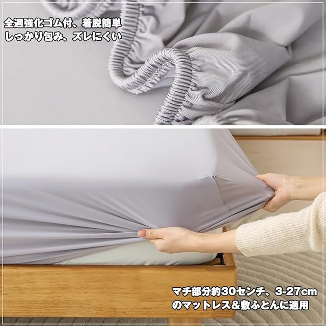 「360度ゴムバンド設計 厚いマットレスも完全フィット」伸縮性抜群、最大27cm厚のマットレスにもピタッと密着(サイズ調整可能)。伸縮率200%を実現しながら型崩れゼロ。全週ズレ防止ゴムバンド付きで、寝返りをしてもズレないです。