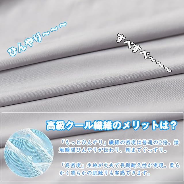 「ひんやりアップ!高密度冷却素材で暑い夜も快適睡眠」当商品は独自開発の「クールテック繊維」を採用。QMax0.4以上を実現しました。接触瞬間からひんやり感が湧いてきます。吸熱・放熱効果に優れ、エアコン依存を軽減する上に、汗をすっかり吸収し、ベタつかず朝まで快適に眠れます。
