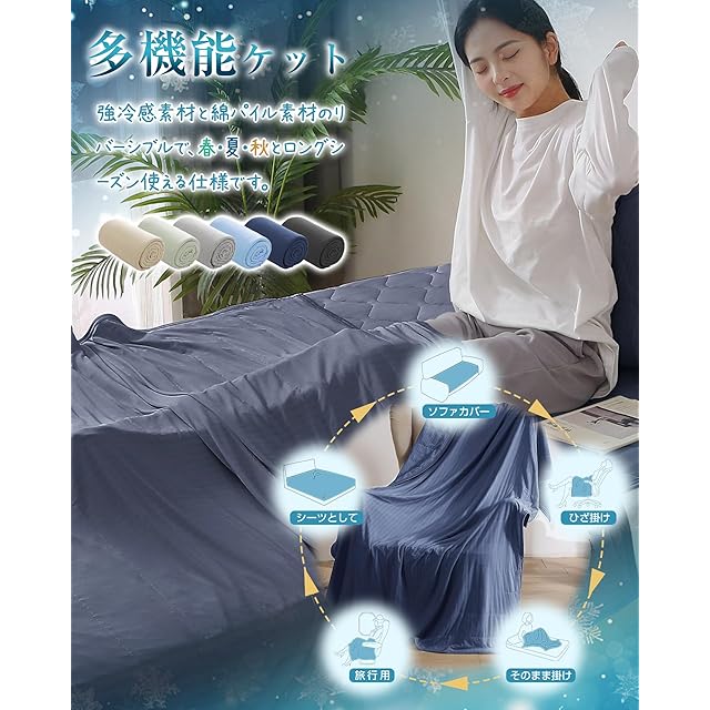 【仕様】3つのサイズ:シングル(140×200cm)、セミダブル(160*200cm)、ダブル(180×200cm) 【素材】さらさら・もちもちな「接触冷感面」とふわふわな「タオル生地面」を兼ね備えた、両面使えるリバーシブル素材です。普段はパイル生地面を使用し、暑くて寝苦しい日には接触冷感面を使用するなど、気温によって使い分けることができます。ホームだけでなく、オフィスで昼寝毛布として、旅行やソファの上や車内用毛布、またキャンプ等のアウトドア活動においても活用いただけます。