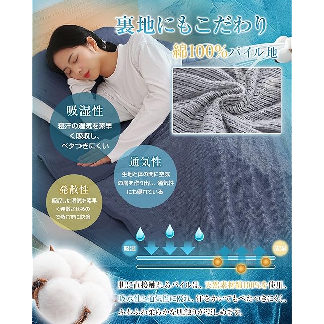 【綿100%パイル・吸湿速乾】裏面は吸湿発散性の高い綿100%パイルを使われ、熱や湿気がこもりにくい点がメリット。汗をかいても素早く吸収し乾かしてくれるため、汗かきの方でも快適に眠りやすくなります。梅雨時期の少し肌寒い日などはおもて面を内側にして使用することがおすすめ。
