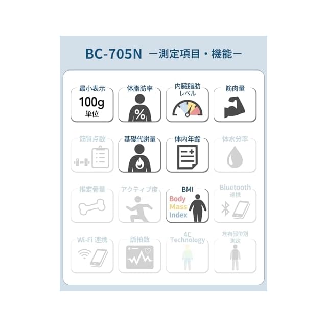 商品名:タニタ 体重計 体組成計 ヘルスメーター BC-705N【体脂肪率/内臓脂肪レベル/筋肉量/基礎代謝量/体内年齢/BMI/日本製/乗るピタ】