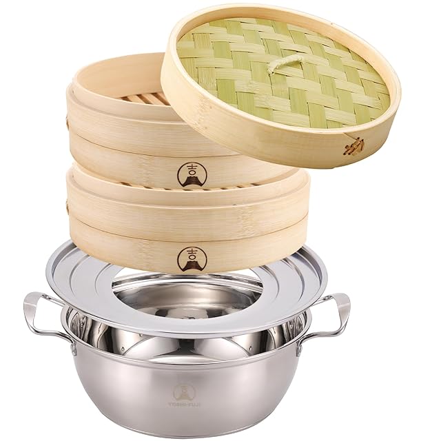 【吉冨士工芸】 21cm 竹せいろ 2段 IH対応鍋付き セット 蒸し器 中華 せいろ セイロ専用シート20枚付 (21cm鍋付き)