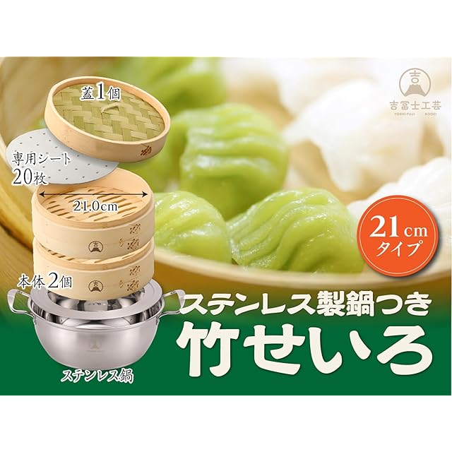 商品名:【吉冨士工芸】 21cm 竹せいろ 2段 IH対応鍋付き セット 蒸し器 中華 せいろ セイロ専用シート20枚付 (21cm鍋付き)