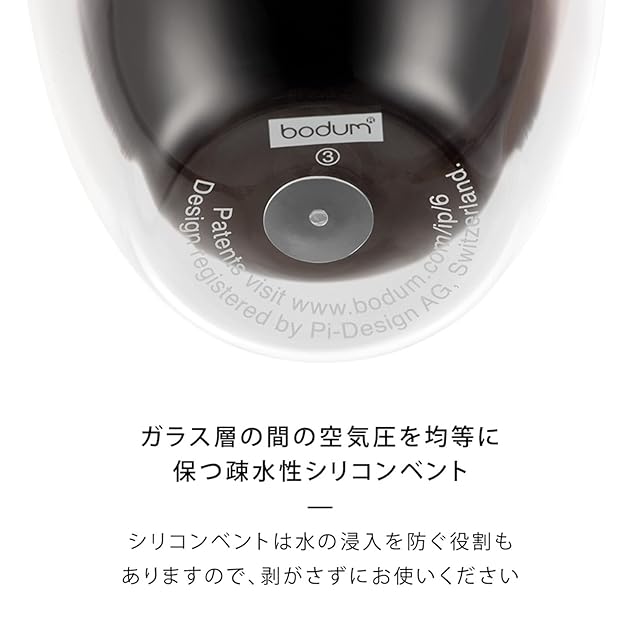 底には、ダブルウォール生成のための空気の逃げ道跡(ポッチ)がついております。 本品は、ボダム・ジャパンを通して輸入された正規輸入品です。