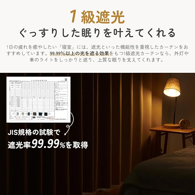 【商品仕様】※組成:ポリエステル100%生地を採用し、シルクのような柔らかさとマットな質感を実現。※機能:遮光1級 / 遮熱保温/ ウォッシャブル / 形状記憶加工。※縫製:1.5倍ヒダ/ 2ッ山を採用し、カーテンの出来上がり幅に対して使う生地の幅を1.5倍としっかり使うことで気密性が高くなり、遮光性や保温性がアップします。※形状記憶加工:カーテンを波型に整え、ピシッと整った状態を長く保ちます。