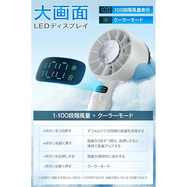 【風量無段階調節&12枚羽根構造ハンディクーラー】風量は1〜100まで細かく調整可能。電源を入れて+ボタンを押すと、初期設定で10の風量からスタートします。+ボタンを短く押すたびに風量が1段階アップ、長押しでスムーズに連続調整可能。−ボタンで逆方向にも対応。さらに、12枚羽根の高性能設計により、一般的な携帯扇風機よりも強力な送風を実現しています。