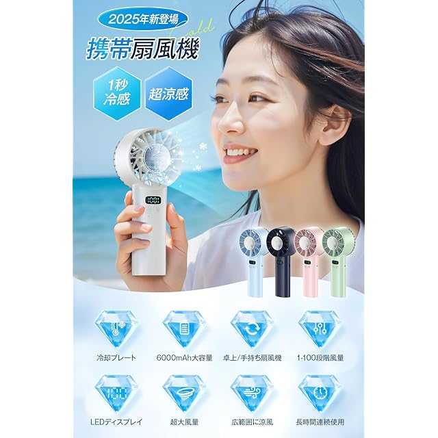 携帯扇風機 ハンディファン 【2025年モデル & -25℃瞬間冷却】 冷感プレート 手持ち扇風機 ミニファン 12枚羽根 6000mAh大容量 軽量 強力 静音 1~100無階段風量 USB-C充電式 卓上扇風機 小型 ポータブル 冷却 ストラップ付き LEDディスプレイ 熱中症対策 アウトドア/スポーツ観戦/オフィス/夏祭りなどに適用 ギフト (ホワイト)