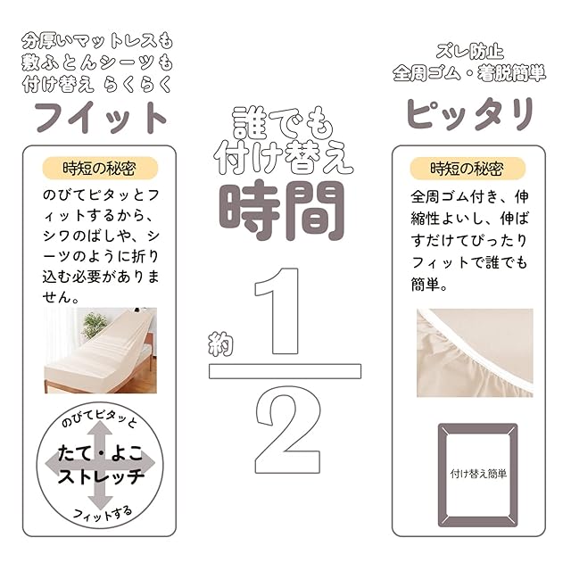 【ズレ防止全周ゴム・着脱簡単】ボックスシーツの全周ゴム付き、伸縮性よいし、伸ばすだけてぴったりフィットで誰でも簡単。敷き布団にもソファベッドにも引っ掛けたまま折り畳むこともできて手間かかりません。子供や寝相の悪い方がどう寝返を繰り返してもズレないです。