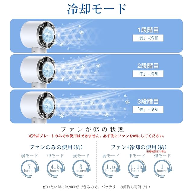 ❄【1秒で冷感!冷却プレート付きハンディファン】この2025年新登場の冷却プレート付き扇風機は、氷のような触感を実現します。特徴する冷却プレートとファンの二重構造で、最大で10℃まで体感温度を下げることができます。効果的にファンの風で肌の熱を吹き飛ばし、肌に心地よい氷のような冷感をもたらします。この携帯扇風機は熱中症対策には最適です!ファンのオン状態で、押してクールモードになって、白いクールモードランプが常に点灯。もう一度押すと、クールモードが閉じています。(クールモードはファンが123速風の起動状態だけで使用できます、個別開けることができません)