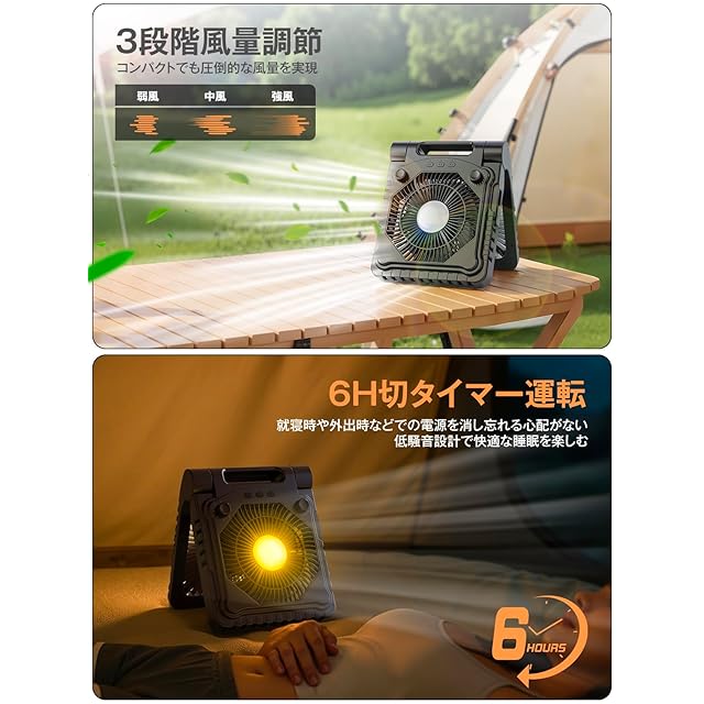 【3段階風量調節・切タイマー・低騒音】弱・中・強の3段階の風量調節が可能で、風量ボタンは左/右に回す段階を切替でき、使用時はお好みに合わせて自由に風量を調節できます。最大風速は5m/s!しっかりパワフルな風で、アウトドアも涼しく快適にお過ごしいただけます。7枚羽根の独自設計で、ふんわりやさしい風なのが特徴だ。消し忘れや冷え防止にも安心のタイマー機能付きで、2・4・6時間の設定が可能。静音性にも優れているため、真夏の夜もぐっすり快適に過ごせます。