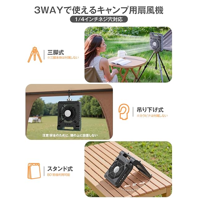 【3way設置・持ち運び便利】卓上型、自立型(スタンドとカラビナが別途必要)、吊り下げ型の3Way扇風機。設置場所を自由に選べるため、テント内、テーブルの上など、設置場所に合わせて選べます。ハンドル付きてさまざまな場所に気軽に持ち運び可能です。キャンプ、ハイキング、庭での作業、屋外の仕事、オフィス、寝室、釣り、夏の野外活動や緊急時(地震、停電など)の理想的なアイテムです。ご注意:製品を閉じる力が強くなりすぎると接続金具を損害場合がございます。