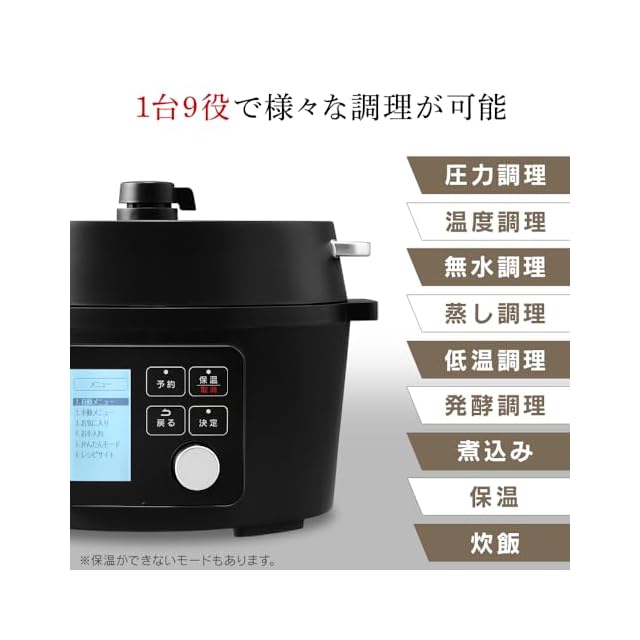 【料理の幅が広がる1台9役】圧力調理/無水調理/蒸し調理/煮込み/炒飯/低温調理/スロー調理(温度調理に含まれる機能です)/発行/保温(保温できないモードもあります)