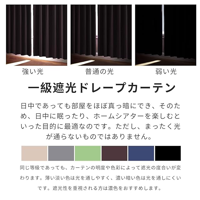 ◆【一級遮光】このカーテンは遮光度が99.99%以上,外からの光をほとんど通さないため、昼間カーテンを閉めたお部屋のなかで相手の顔の表情が分からない程度にまでお部屋を暗くできます。同じ等級であっても、カーテンの明度や色彩によって遮光の度合いが変わります。薄い淡い色は光を通しやすく、濃い暗い色は光を通しにくいです。遮光性を重視される方は濃色をおすすめします。