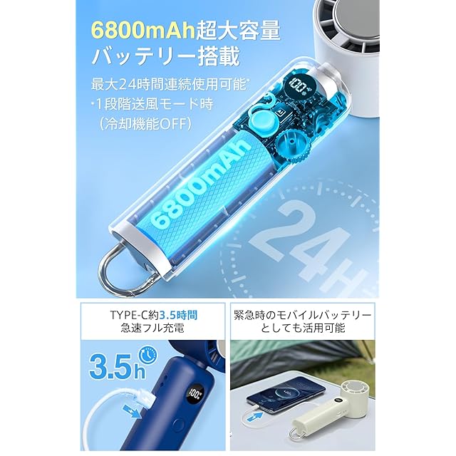 【6800mAh大容量・ 双方向充電】 この携帯扇風機は6800mAhの大容量バッテリーを内蔵し、1段階風量の送風モードには最大24時間連続使用が可能、一日中快適な涼しさを提供します。Type-C急速充電技術を採用し、PC/USB/コンセントなど様々な充電方法に対応。わずか3.5時間でフル充電を実現できます。一台で冷却と充電の両方を叶える、夏の外出に最適なアイテムです。
