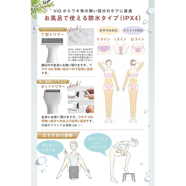 こんな悩みはありませんか?「デリケートゾーンをキレイに処理したい」「脱毛サロン前にVIO処理したい」「カミソリは乾燥や肌荒れする」「除毛クリームはアレルギーやにおいが気になる」「ムダ毛ケアしたいけど、自分にあった方法が見つからない!」そんな女性のためにお客様の声&専門家のアドバイスをベースに開発しました!デリケートなVIOゾーンもしっかりケア!敏感肌でも使えるように肌に優しい設計!どこでも使えコンパクト設計!お手入れは簡単2STEP!①T型トリマーでデリケートゾーン特有の長い毛、太い毛をしっかりカット②ネットトリマーで剃り残しなくつるつるキレイに処理。T型トリマーに付属のアタッチメントを取付すれば、毛量調整や長さを整える事も簡単に!電気シェーバーでよくあるお悩み「肌を傷つけて出血してしまった・・・」「つるつるにならない・・・」当店のレディースシェーバーは風船に押し付けても割れないステンレス素材を使用したプロテクトブレードタイプ。カミソリ負けしやすい肌質の方や金属アレルギーの方にも好評です!デリケートゾーンは全身の中でもケアしにくい部分です。人間工学に基づいた握りやすい持ち手とコンパクトなヘッドでどんな隙間にも入り込んでガンコなムダ毛や細いうぶ毛もしっかりカット!「娘に使わせたいけど安全に使えるか不安・・・」→中高生でも安全にお使い頂けるよう、イラスト58枚に解説が入った取り扱い説明書付きなので安心してご購入下さい。